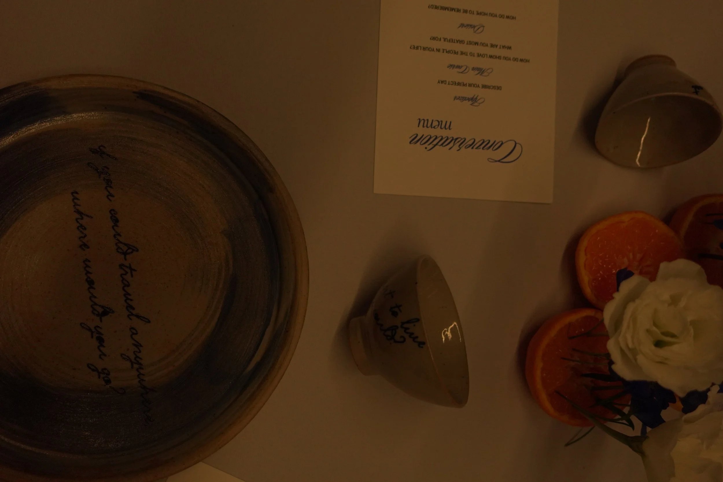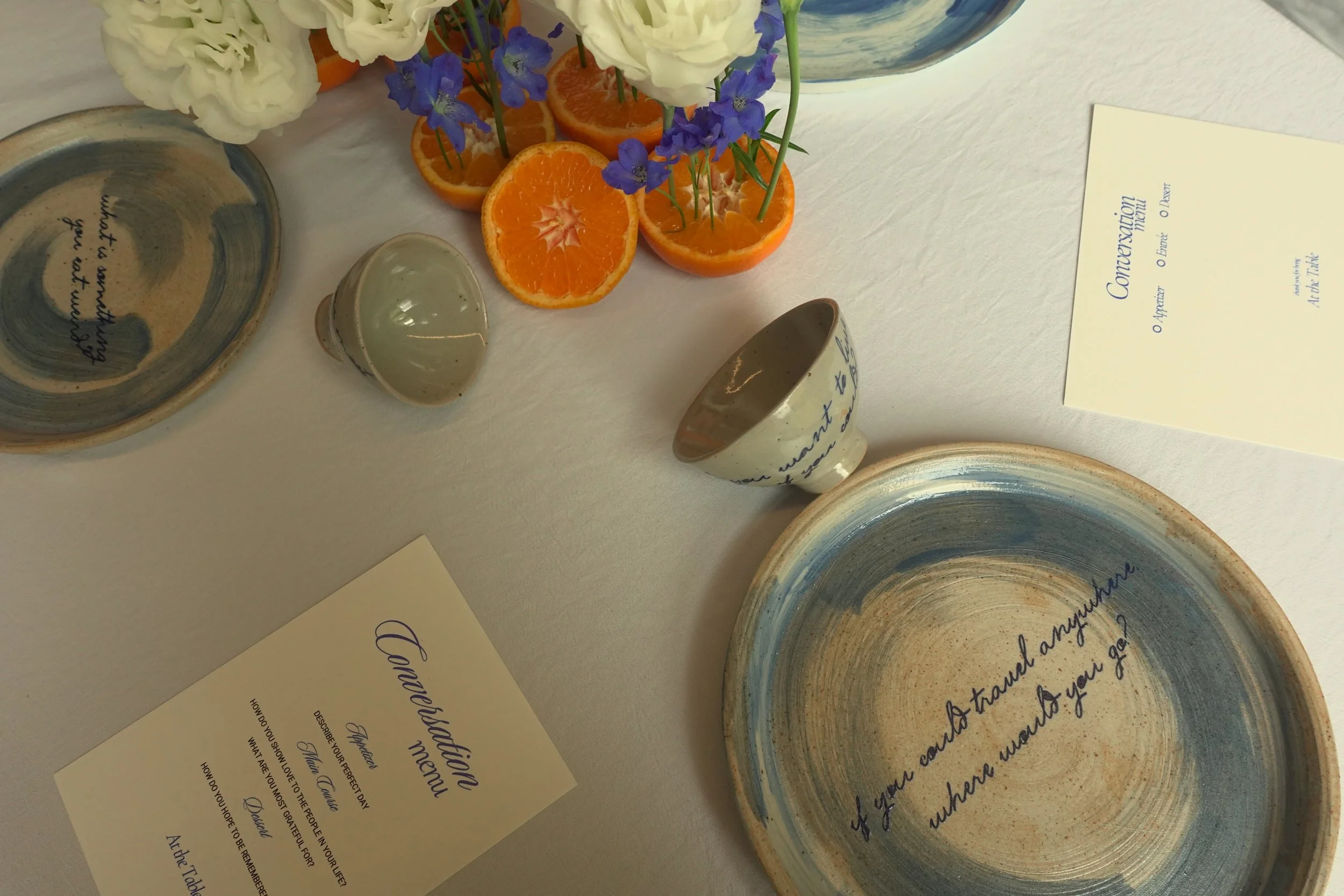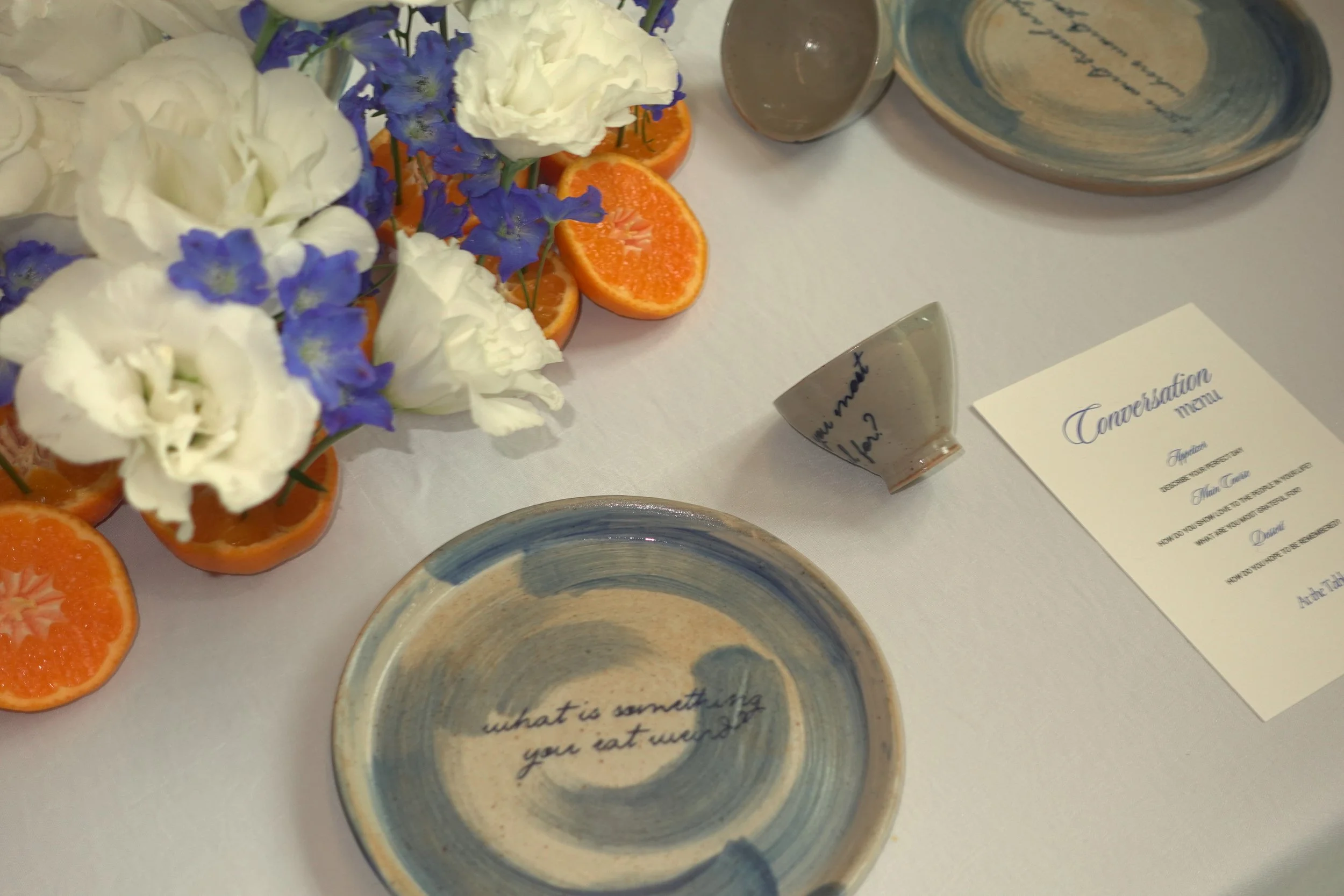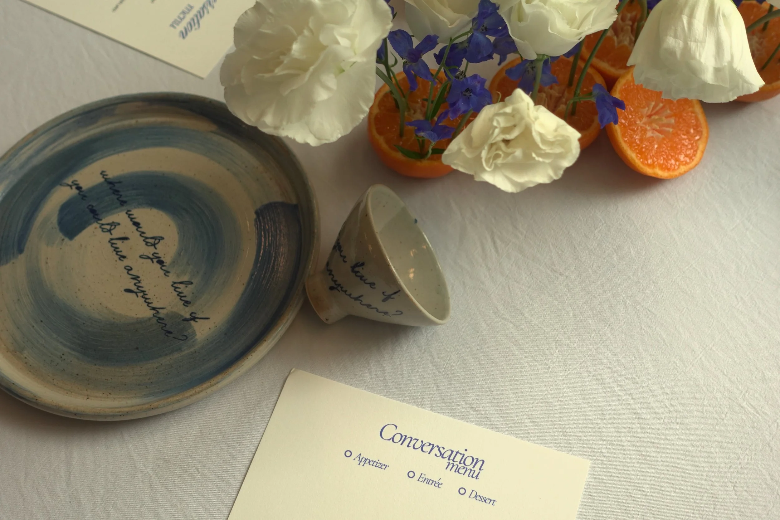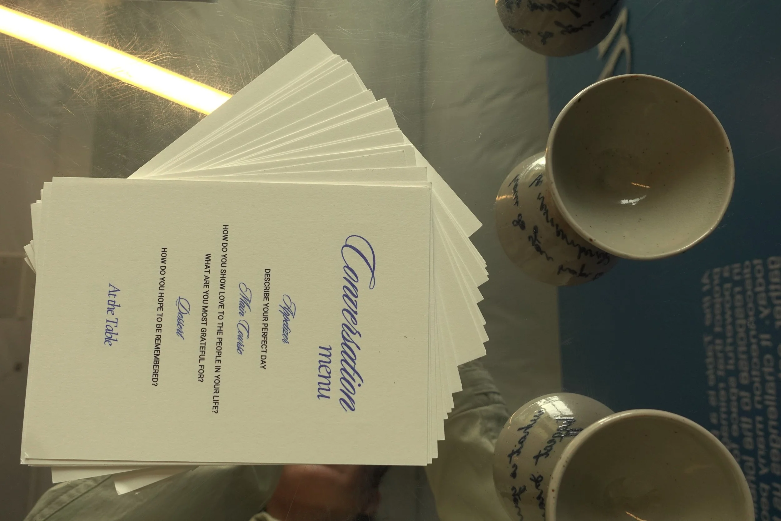 Central to the project is a series of handcrafted ceramic tableware, each piece featuring thoughtfully chosen conversation prompts. These prompts, developed through a combination of psychological research and public input, aim to move beyond superficial small talk and encourage deeper dialogue, promoting vulnerability, empathy, and genuine engagement. The choice of ceramics is purposeful: as essential items for any shared meal, these pieces transform everyday objects into tools for connection by incorporating questions directly into their design. The installation includes a carefully curated tablescape that immerses visitors in a dining atmosphere, along with an interactive "Ask a Stranger" wall that invites guests to actively engage with the themes of the project.