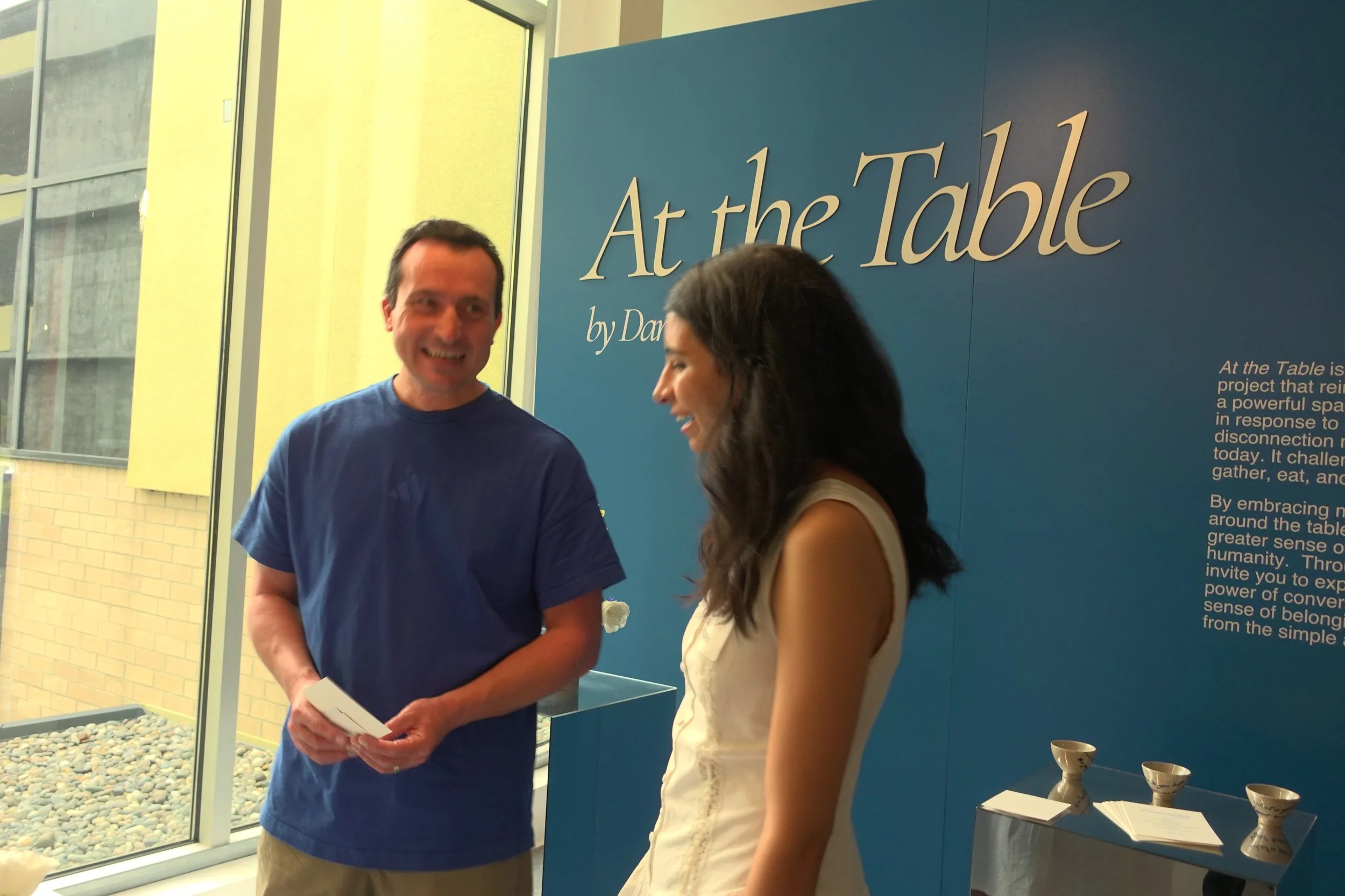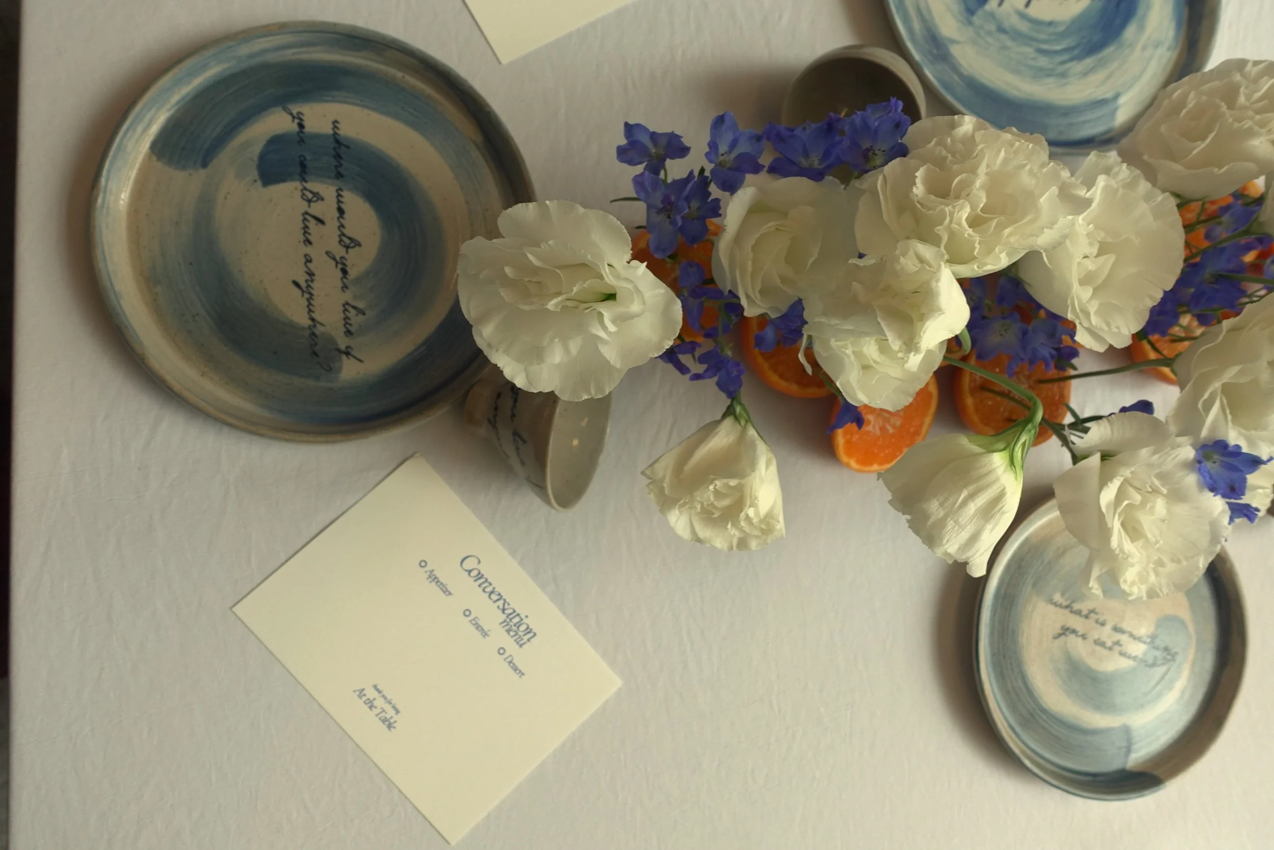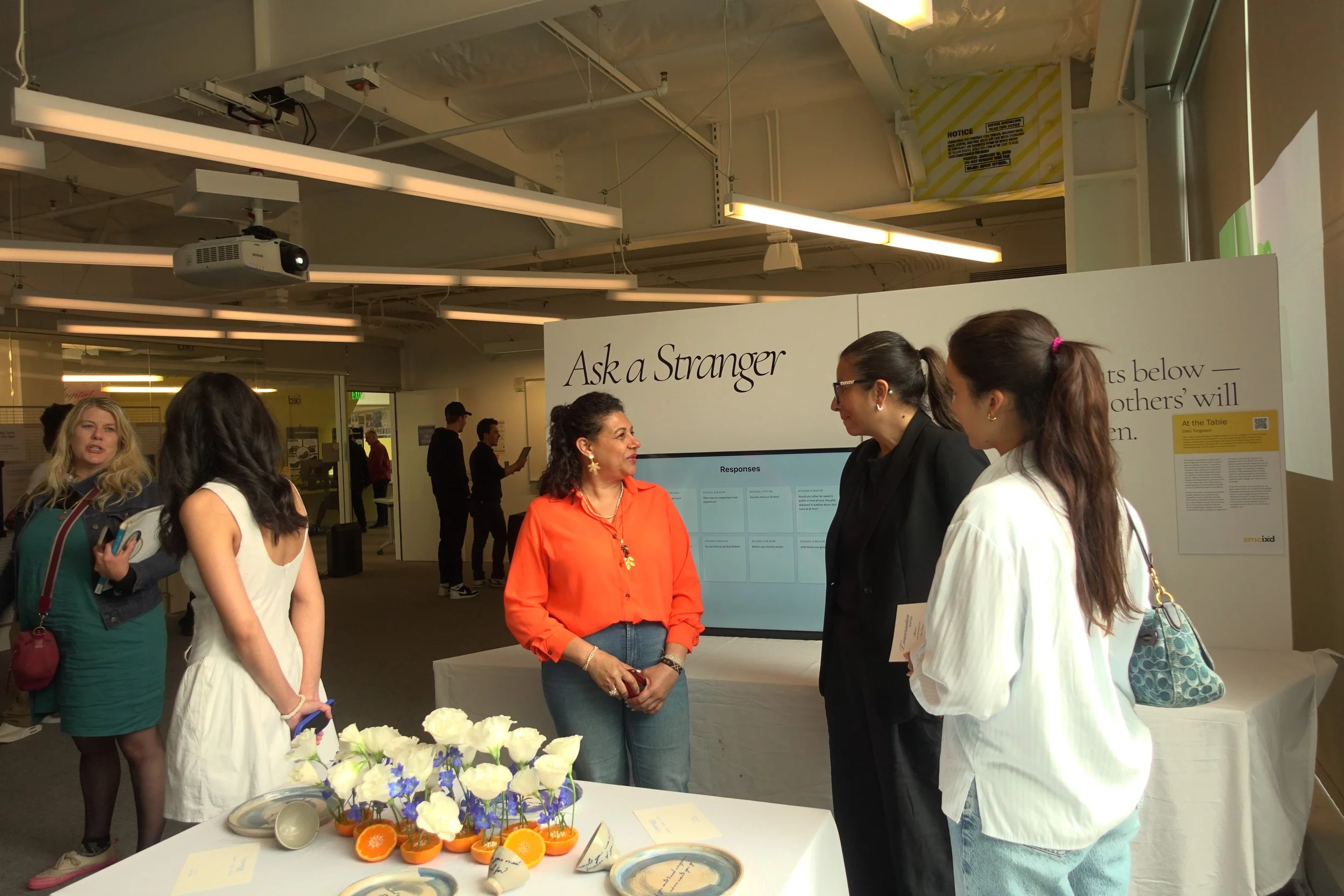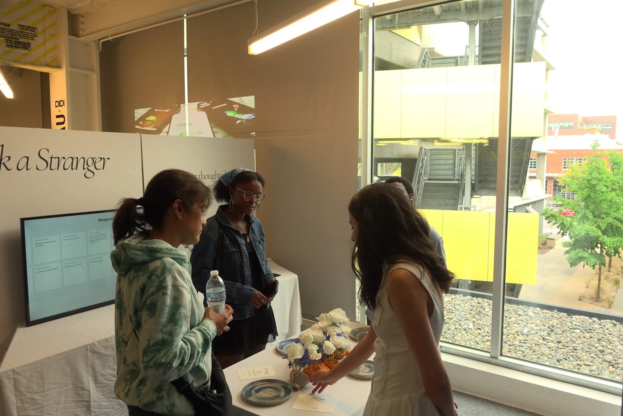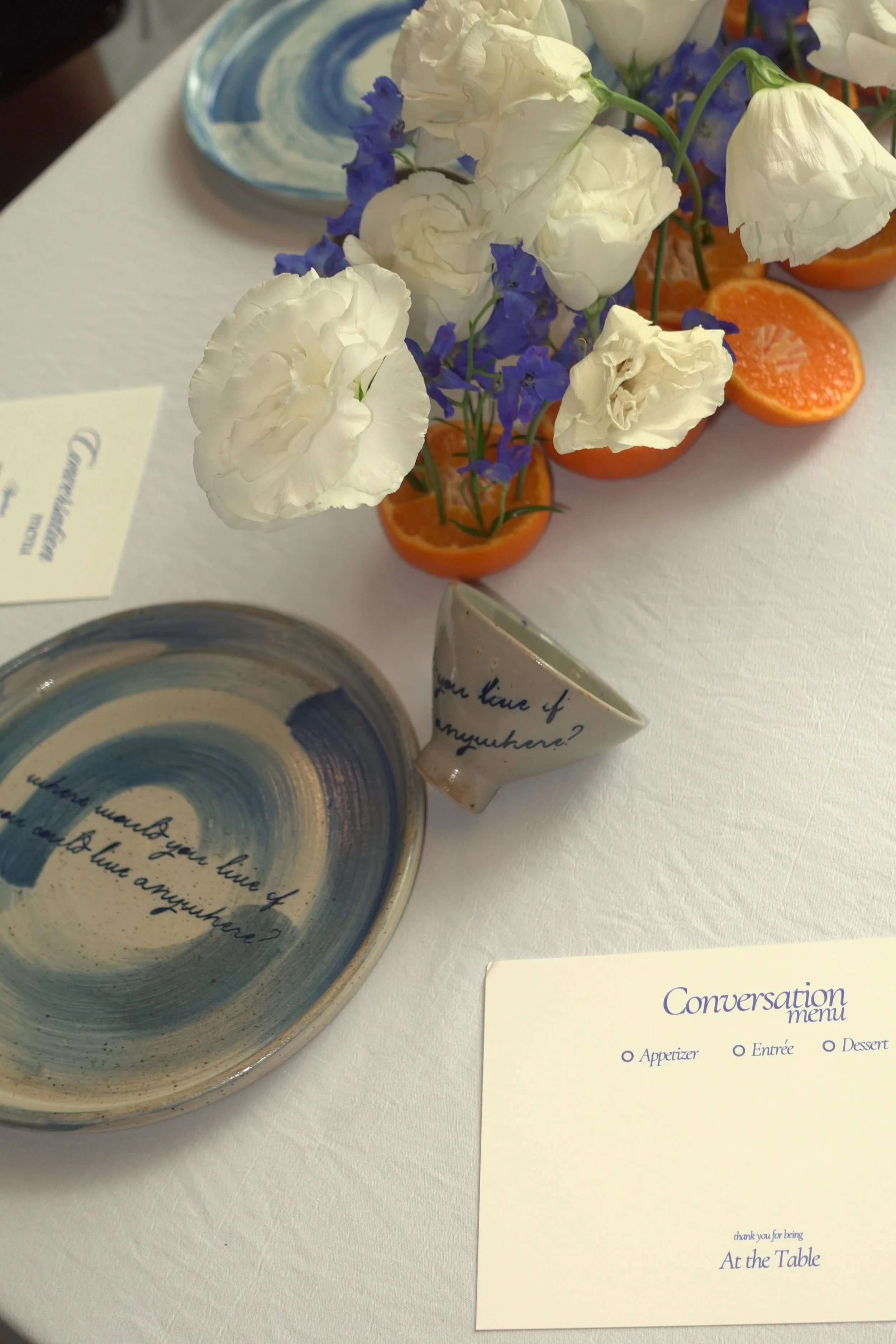 Central to the project is a series of handcrafted ceramic tableware, each piece featuring thoughtfully chosen conversation prompts. These prompts, developed through a combination of psychological research and public input, aim to move beyond superficial small talk and encourage deeper dialogue, promoting vulnerability, empathy, and genuine engagement. The choice of ceramics is purposeful: as essential items for any shared meal, these pieces transform everyday objects into tools for connection by incorporating questions directly into their design. The installation includes a carefully curated tablescape that immerses visitors in a dining atmosphere, along with an interactive "Ask a Stranger" wall that invites guests to actively engage with the themes of the project.