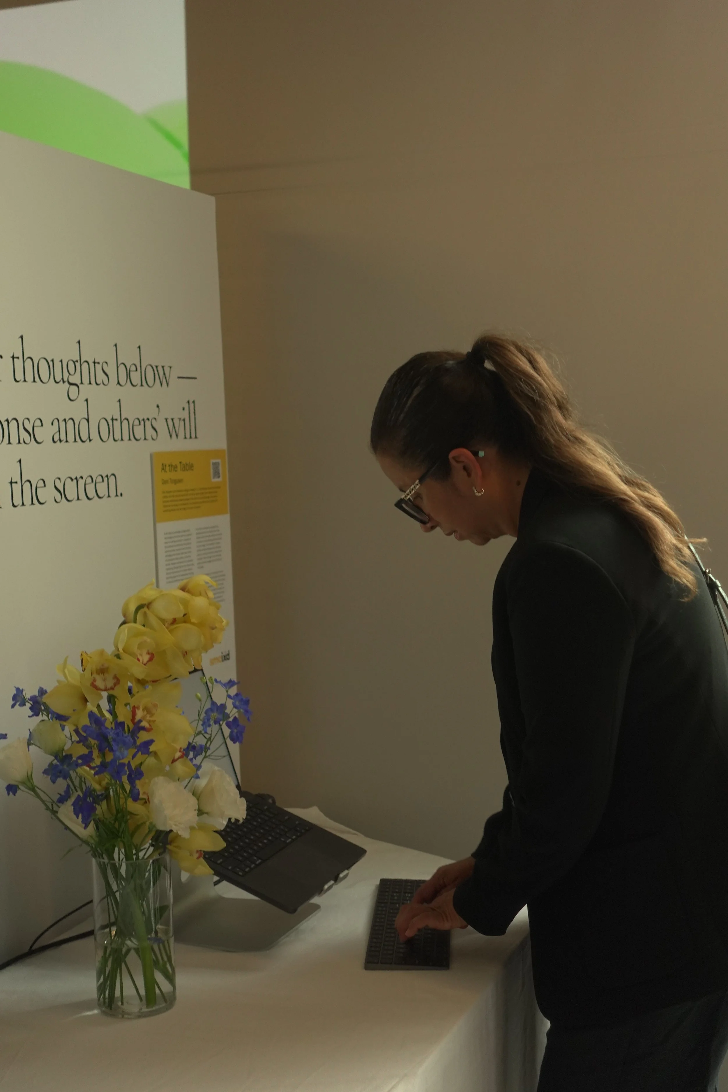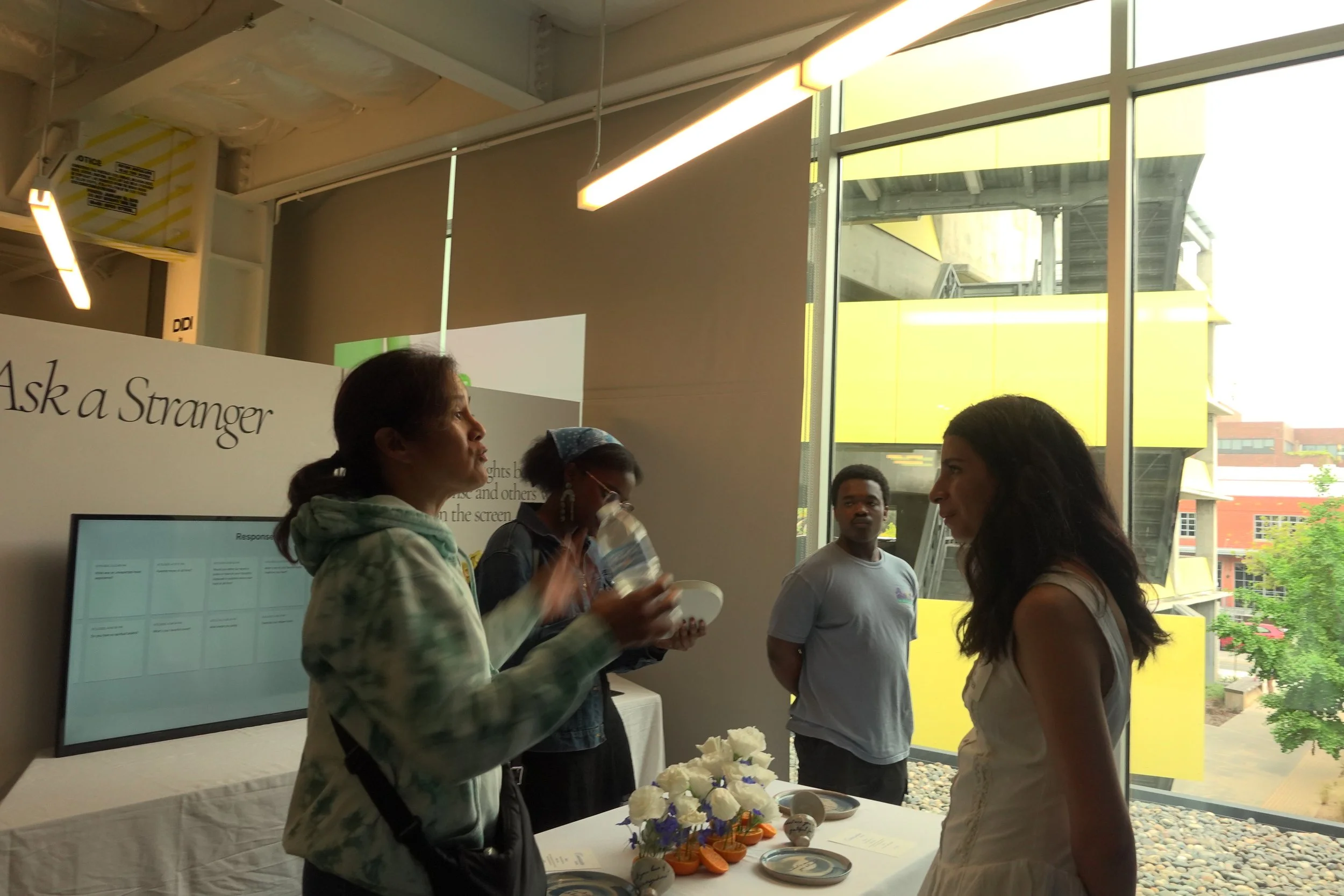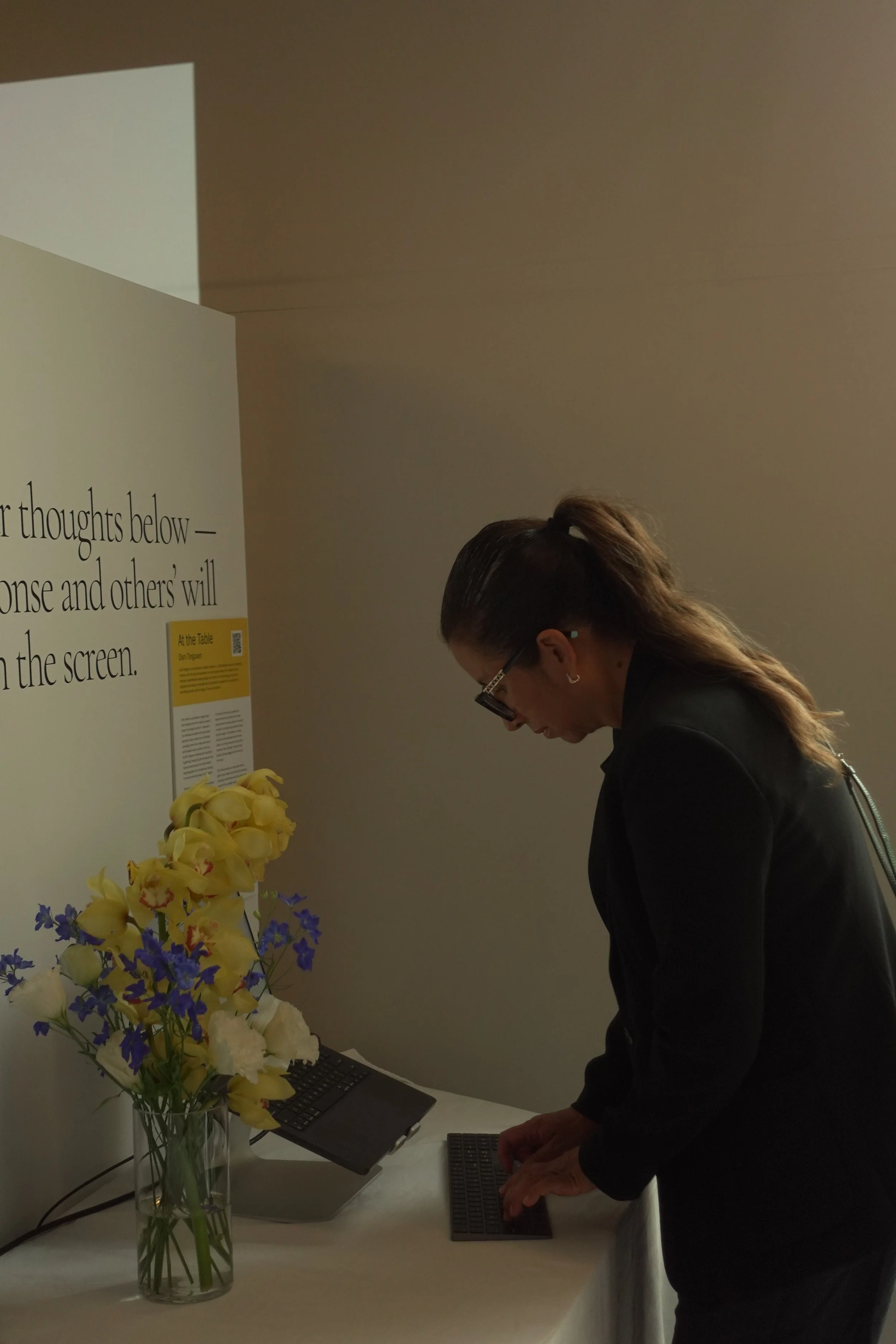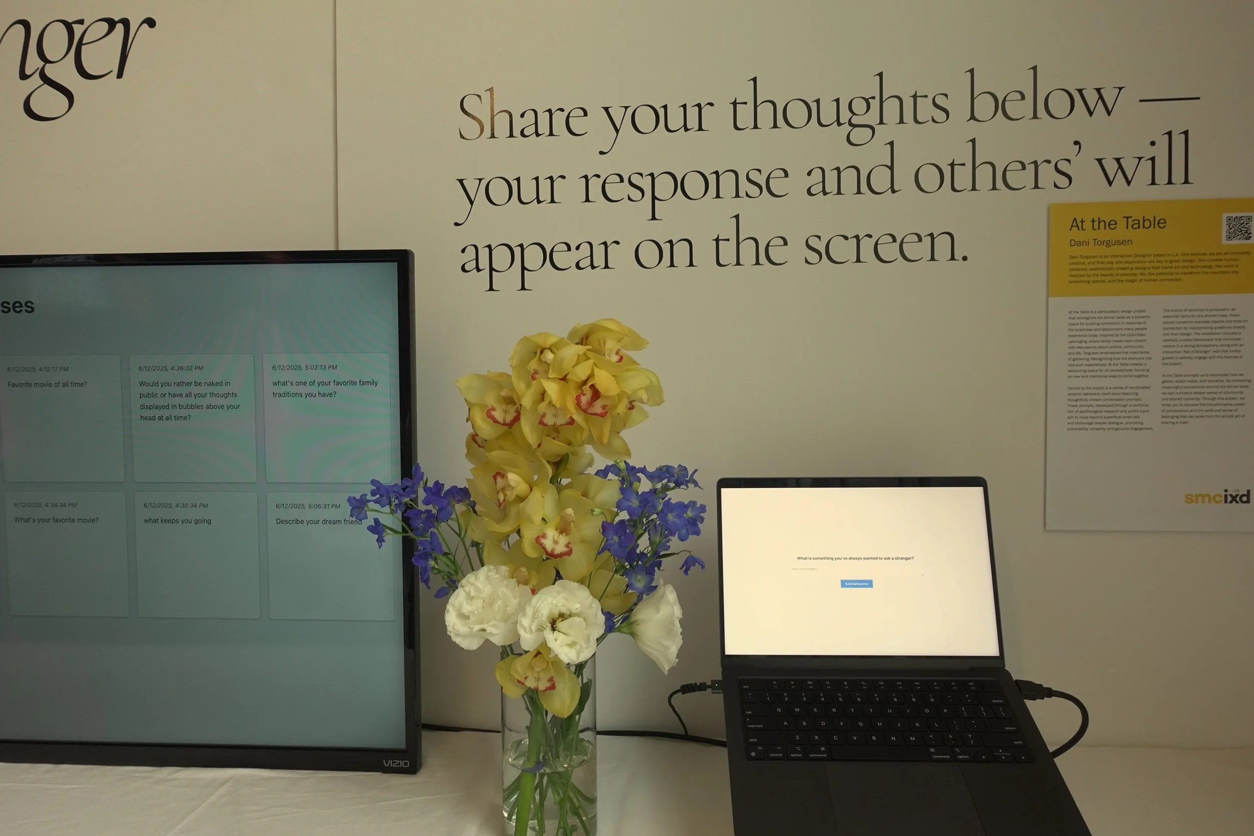The final installation of At The Table brought together handcrafted ceramics, interactive media, and spatial storytelling to create a powerful invitation for connection. The ceramic tableware was the heart of the project—each piece embedded with a unique question that encouraged deeper conversation and reflection. The immersive tablescape featured thoughtful composition to create an atmosphere of warmth and intentionality. The installation was not only visually striking but emotionally resonant—visitors were drawn in by the beauty, and stayed for the meaning. The "Ask a Stranger" wall became a dynamic extension of the dinner table. Using an interactive interface, participants typed their answers to a curated question, which were then projected live onto a nearby screen, where they could view responses that had been collected throughout the night. Visitors lingered, talked, took photos, and—most importantly—engaged with strangers and loved ones in deeper ways. The project succeeded in transforming a physical space into a participatory, emotional experience that modeled how design can foster community through care and conversation.