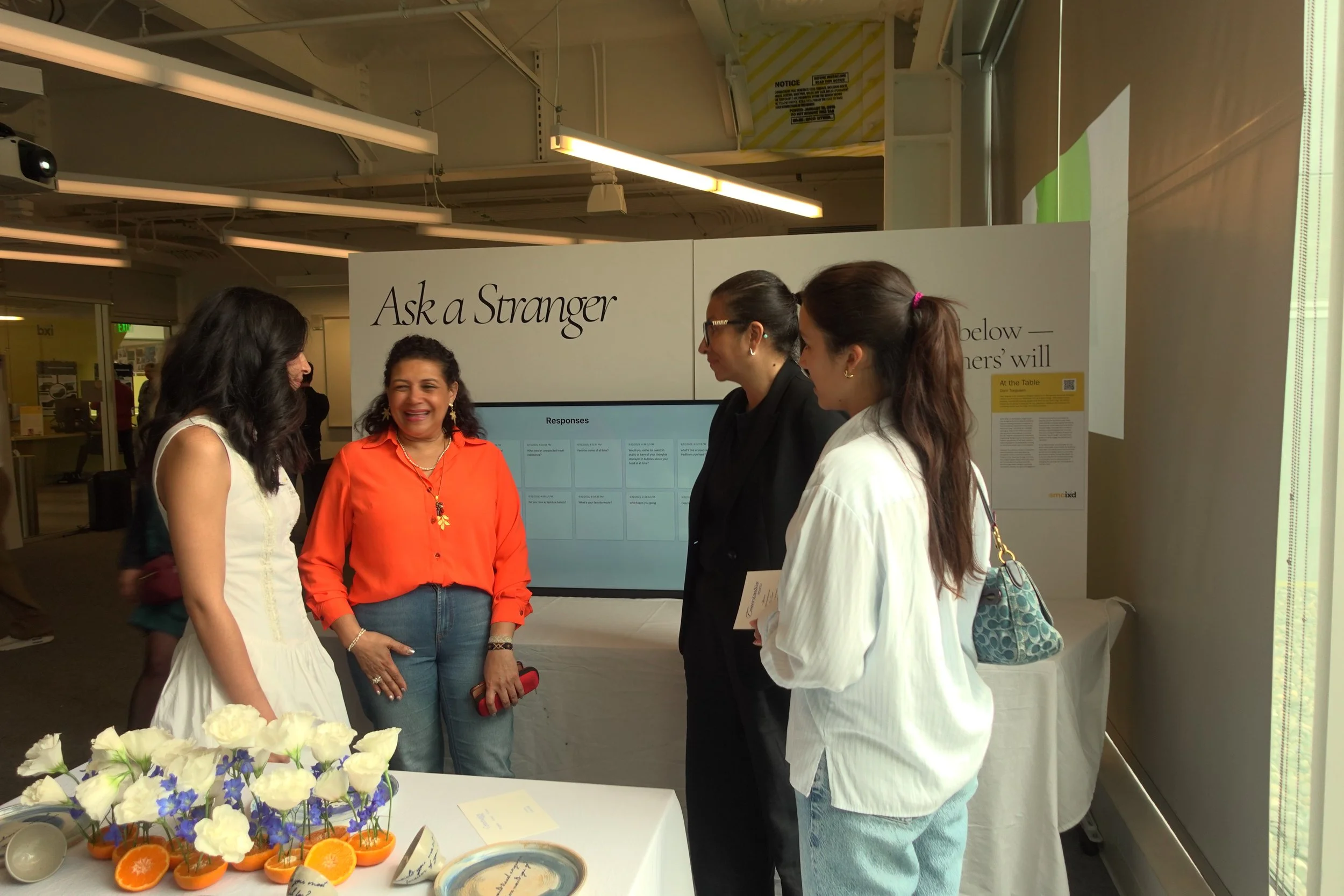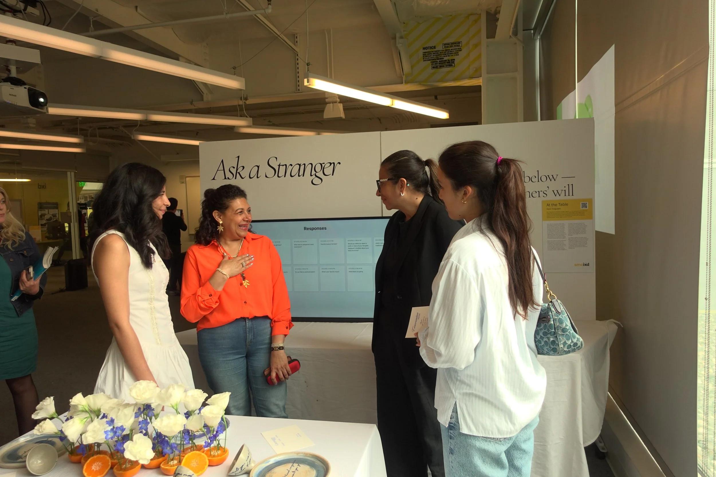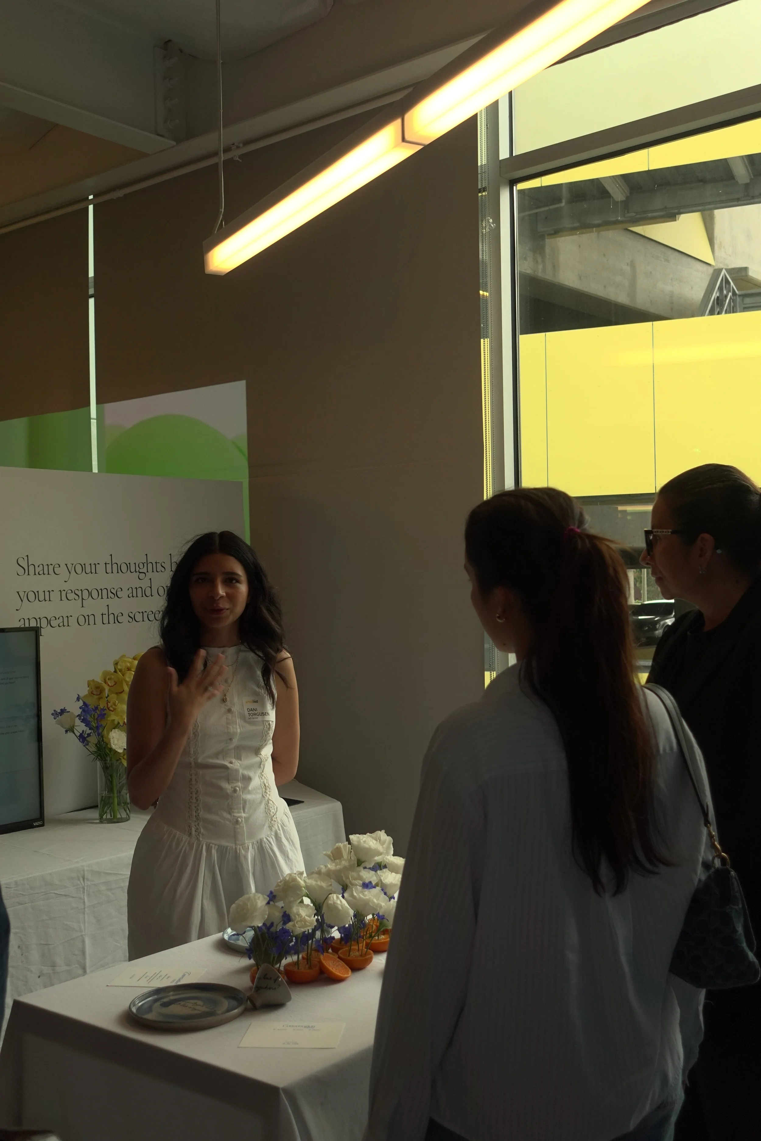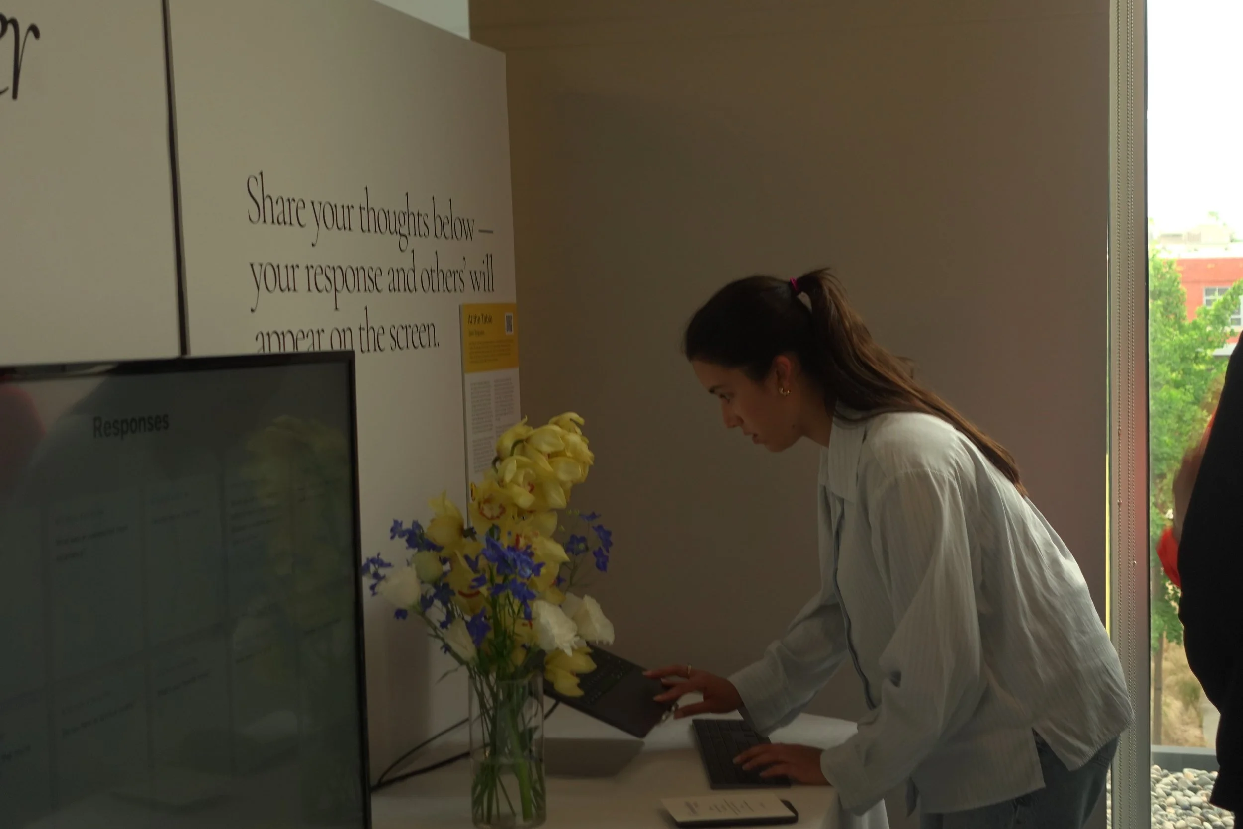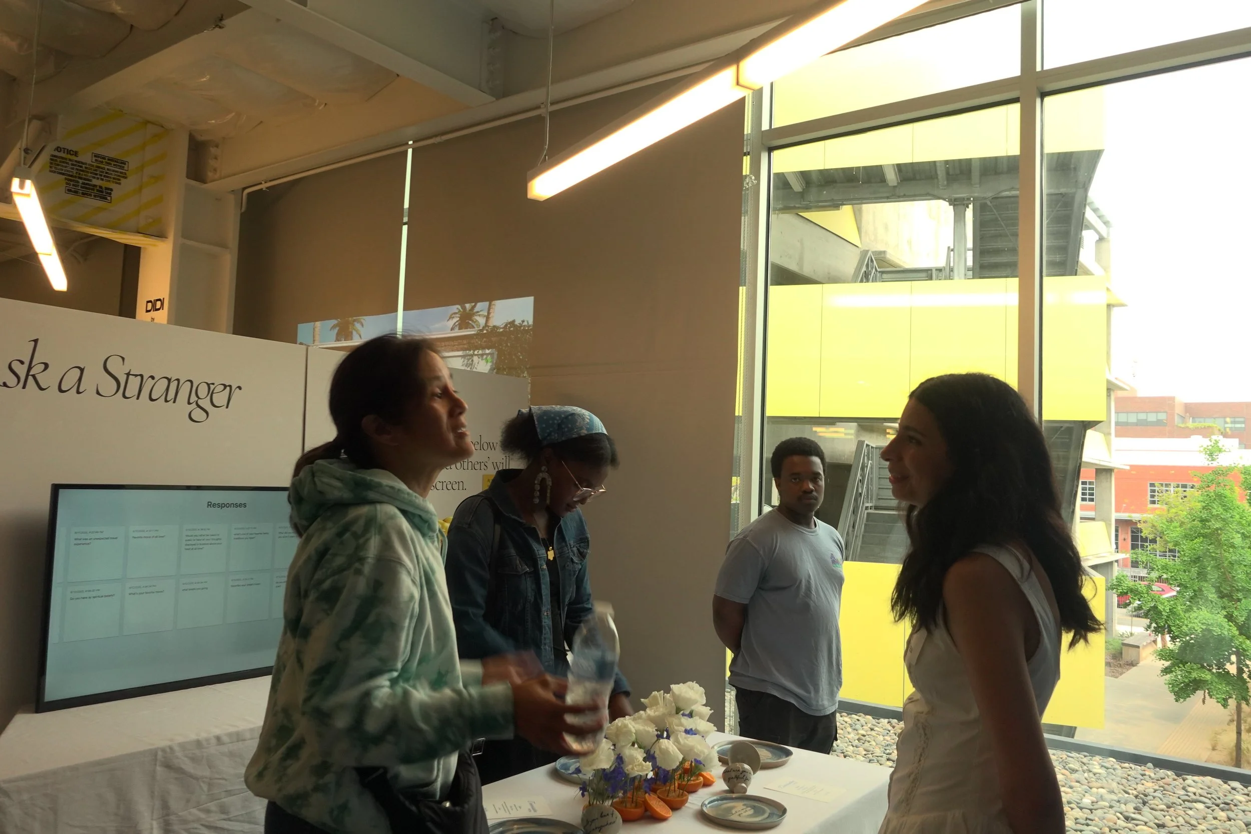 The final installation of At The Table brought together handcrafted ceramics, interactive media, and spatial storytelling to create a powerful invitation for connection. The ceramic tableware was the heart of the project—each piece embedded with a unique question that encouraged deeper conversation and reflection. The immersive tablescape featured thoughtful composition to create an atmosphere of warmth and intentionality. The installation was not only visually striking but emotionally resonant—visitors were drawn in by the beauty, and stayed for the meaning. The "Ask a Stranger" wall became a dynamic extension of the dinner table. Using an interactive interface, participants typed their answers to a curated question, which were then projected live onto a nearby screen, where they could view responses that had been collected throughout the night. Visitors lingered, talked, took photos, and—most importantly—engaged with strangers and loved ones in deeper ways. The project succeeded in transforming a physical space into a participatory, emotional experience that modeled how design can foster community through care and conversation.