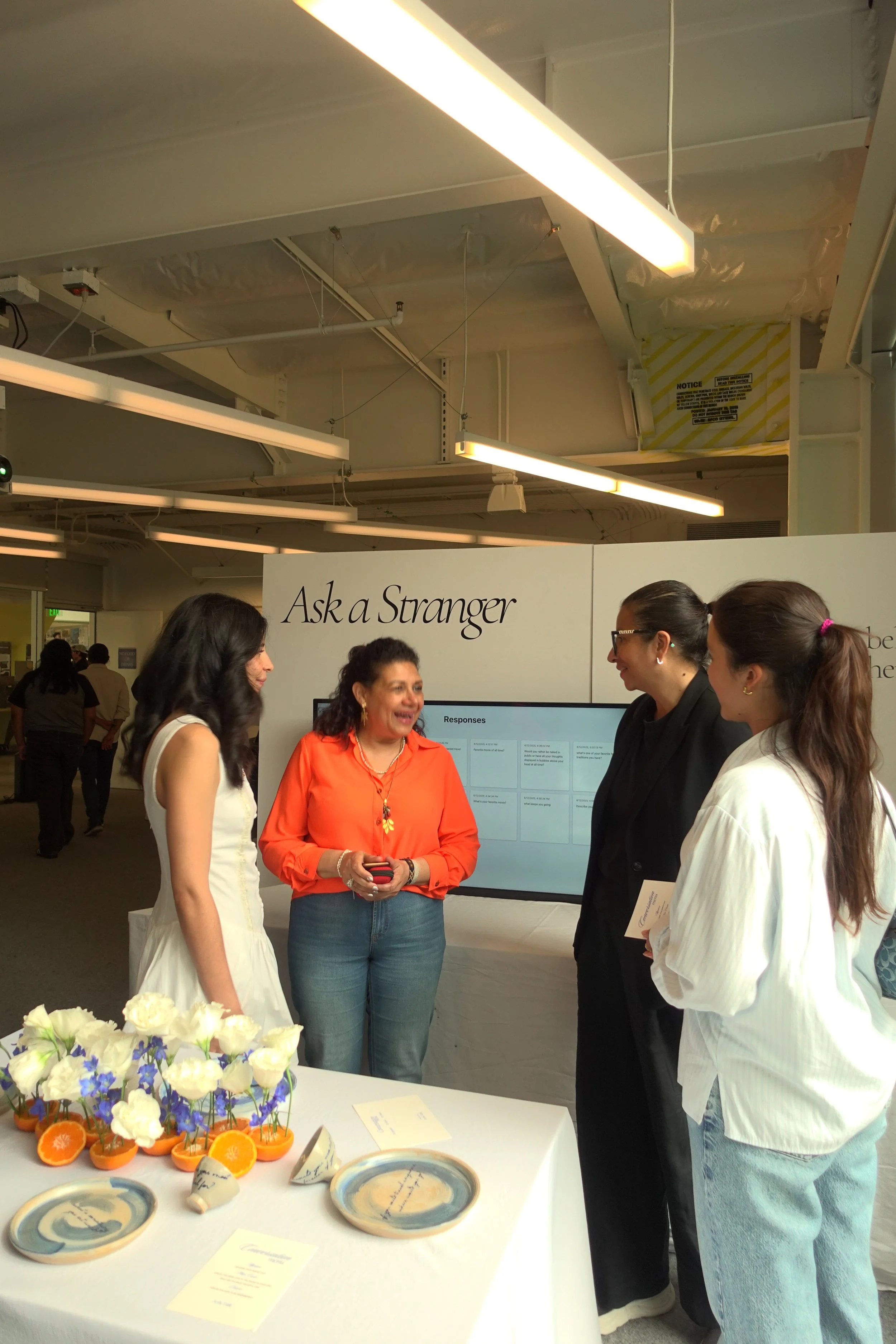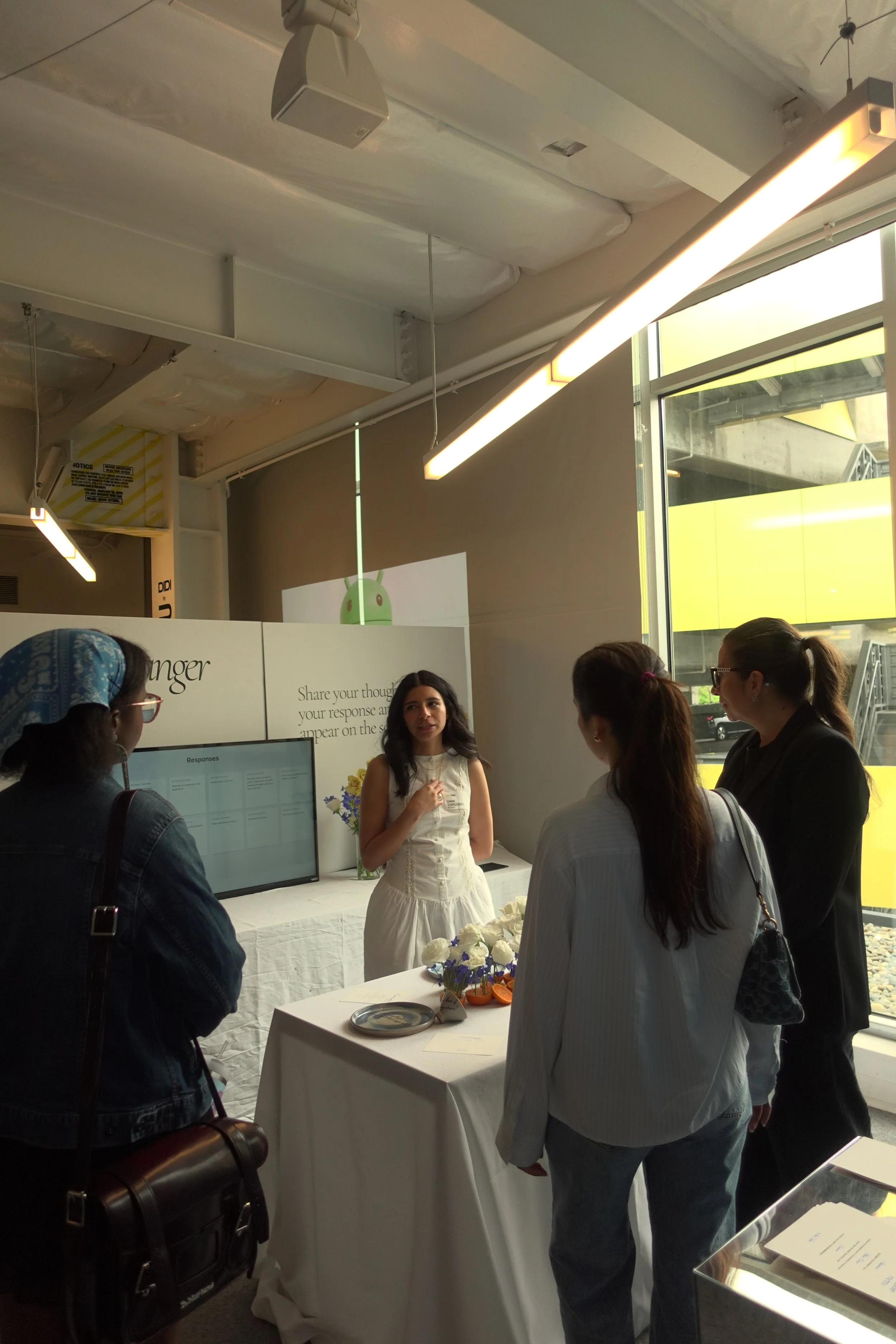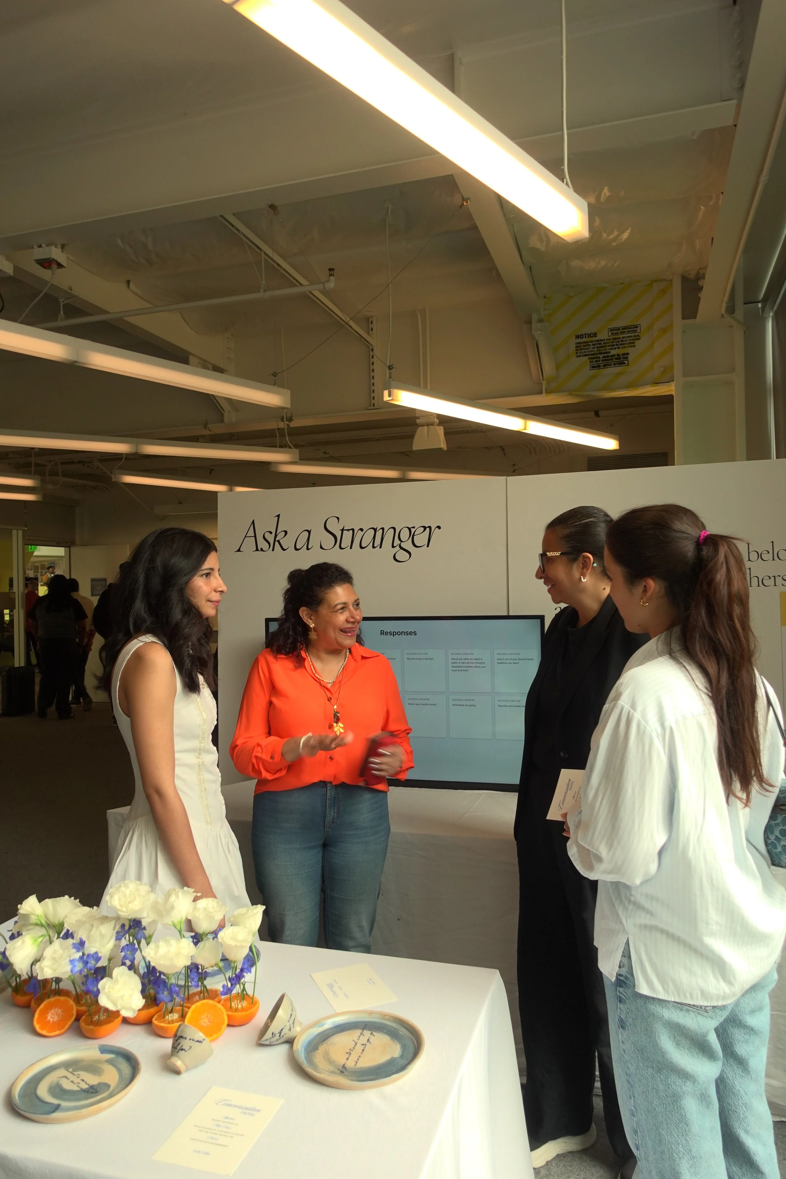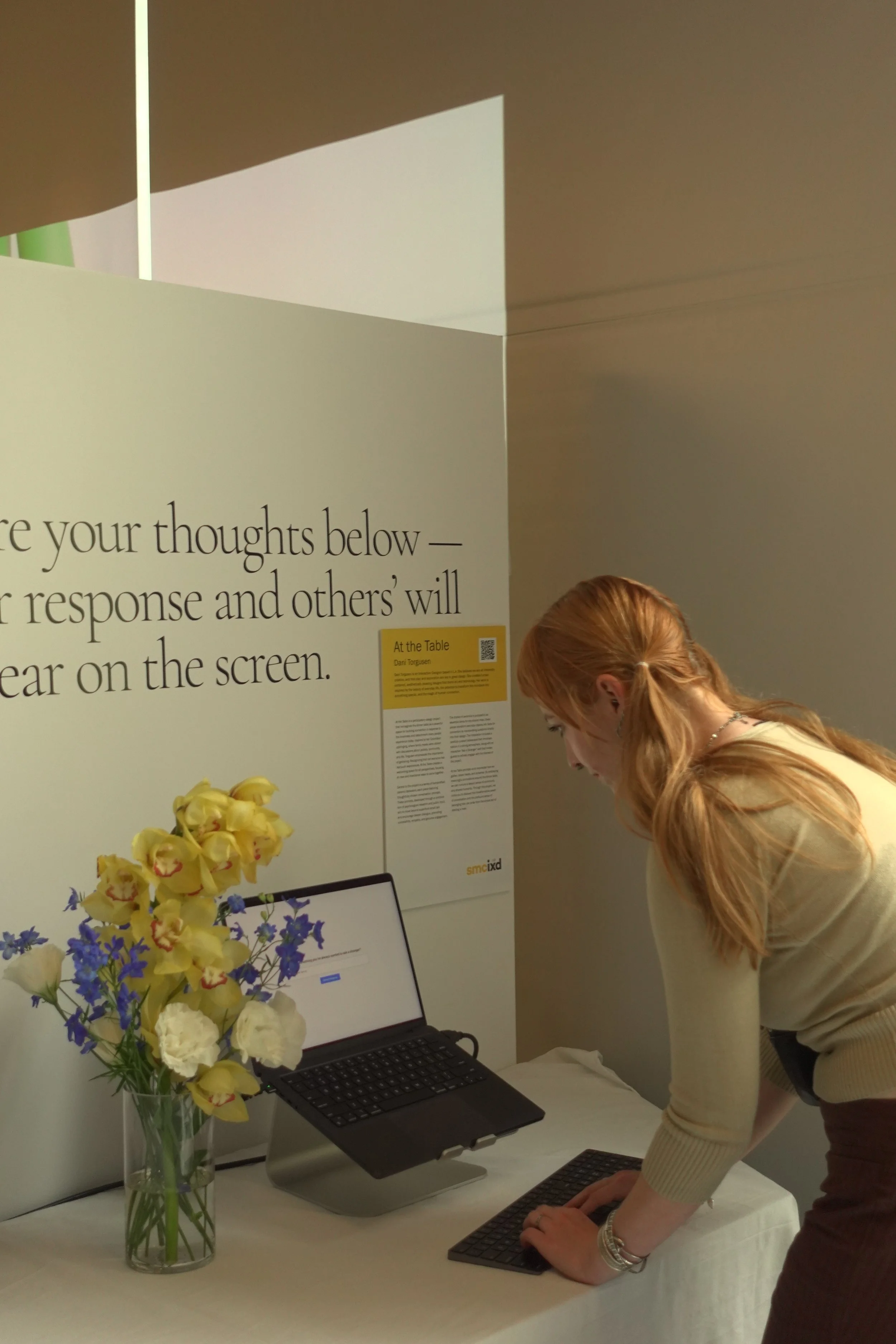 The final installation of At The Table brought together handcrafted ceramics, interactive media, and spatial storytelling to create a powerful invitation for connection. The ceramic tableware was the heart of the project—each piece embedded with a unique question that encouraged deeper conversation and reflection. The immersive tablescape featured thoughtful composition to create an atmosphere of warmth and intentionality. The installation was not only visually striking but emotionally resonant—visitors were drawn in by the beauty, and stayed for the meaning. The "Ask a Stranger" wall became a dynamic extension of the dinner table. Using an interactive interface, participants typed their answers to a curated question, which were then projected live onto a nearby screen, where they could view responses that had been collected throughout the night. Visitors lingered, talked, took photos, and—most importantly—engaged with strangers and loved ones in deeper ways. The project succeeded in transforming a physical space into a participatory, emotional experience that modeled how design can foster community through care and conversation.