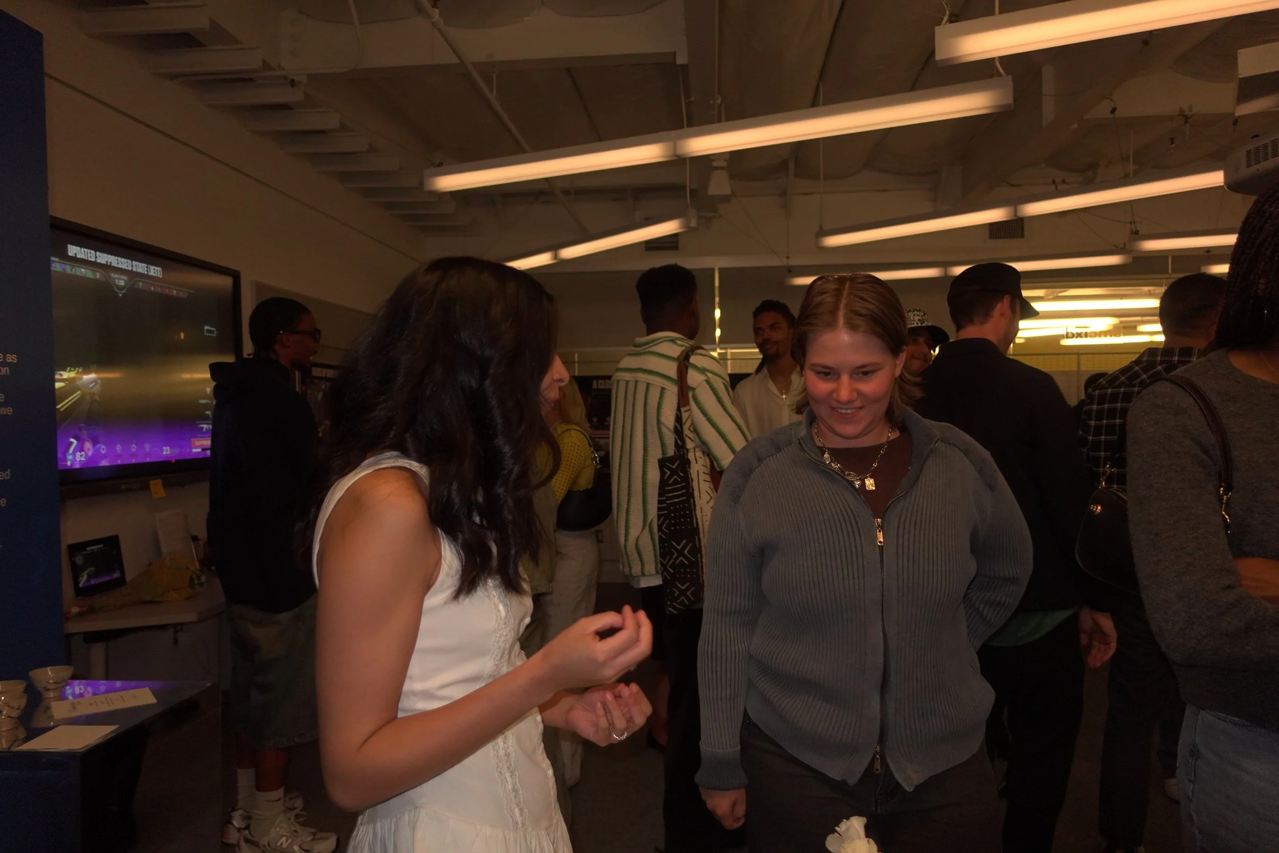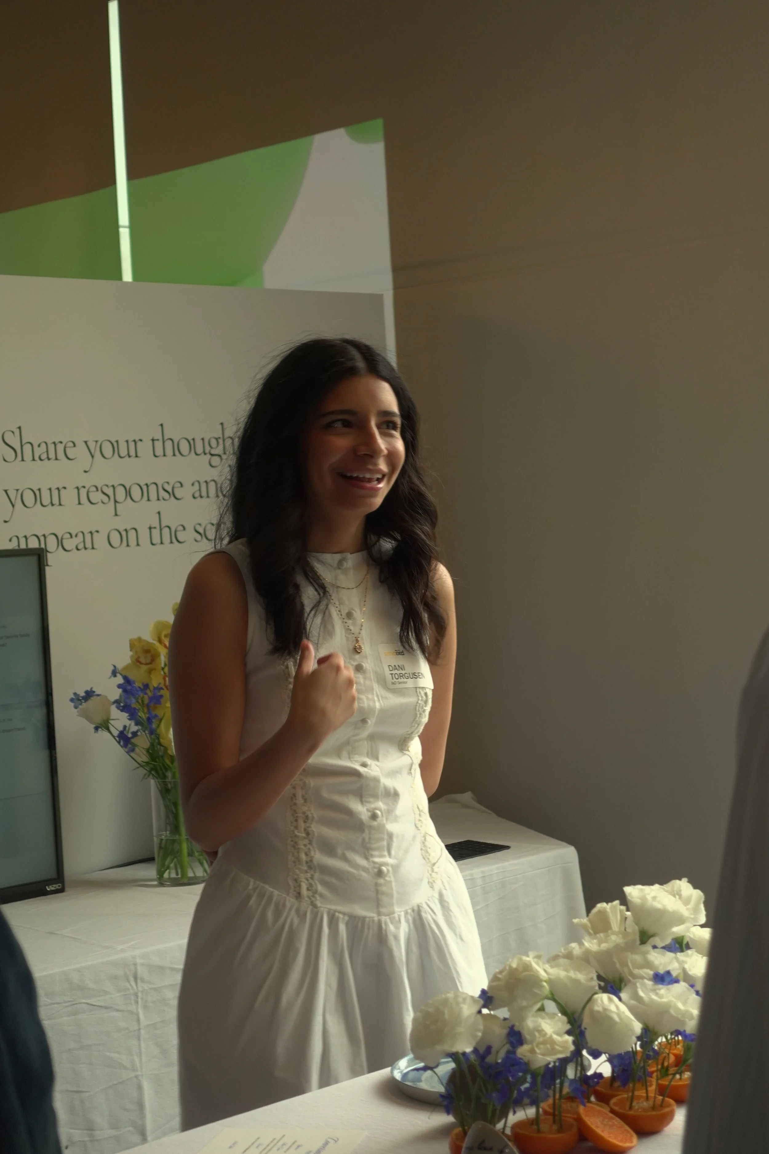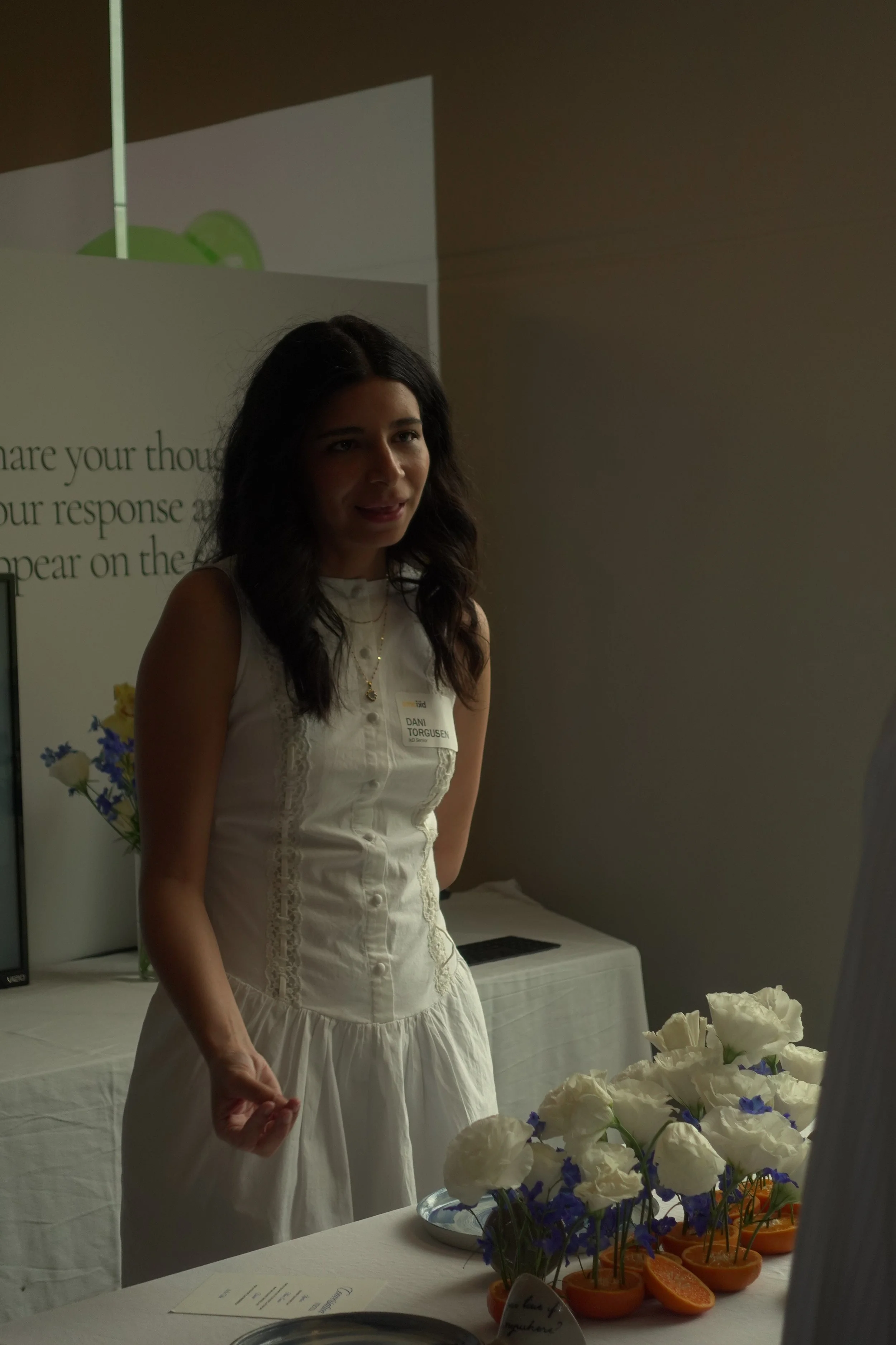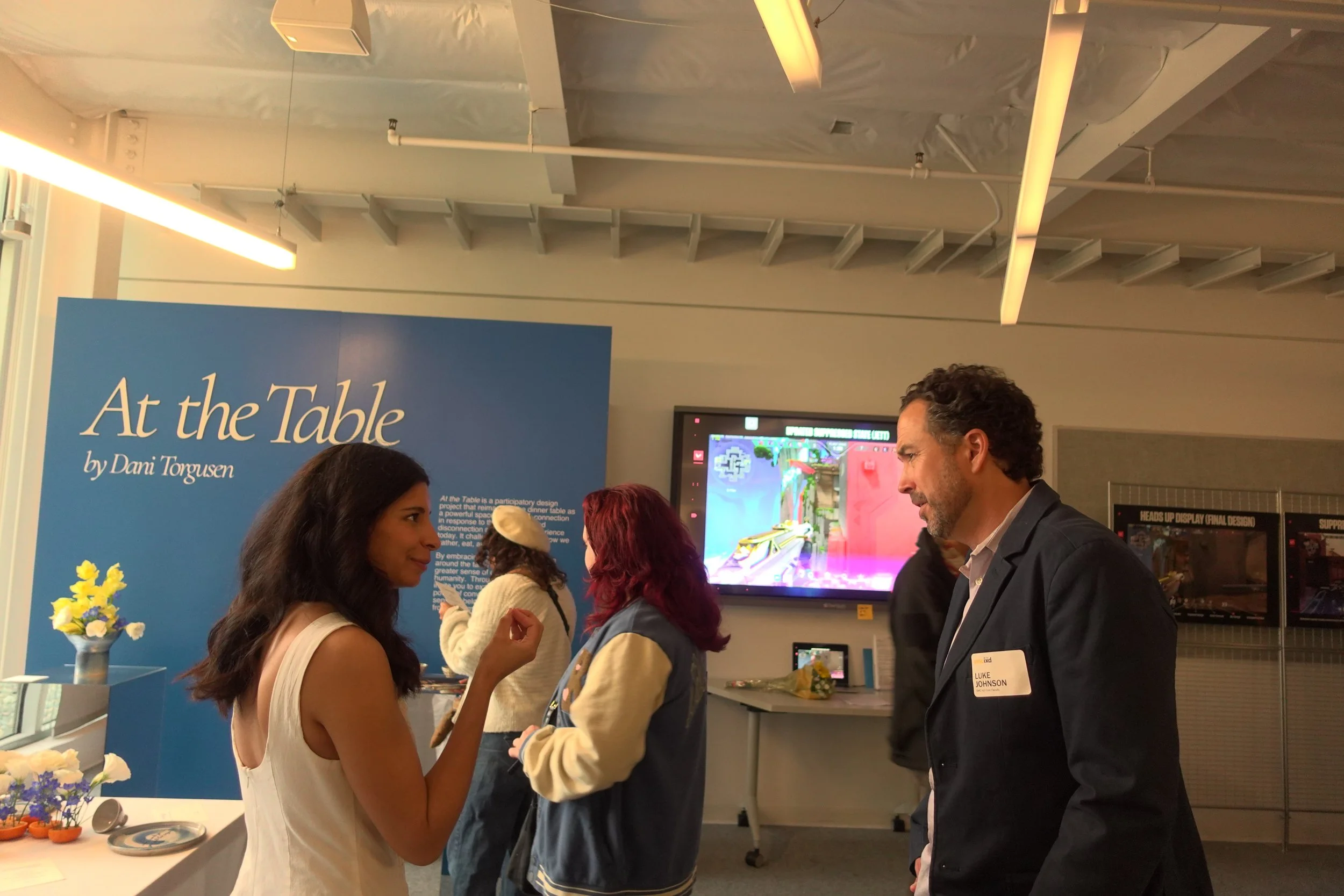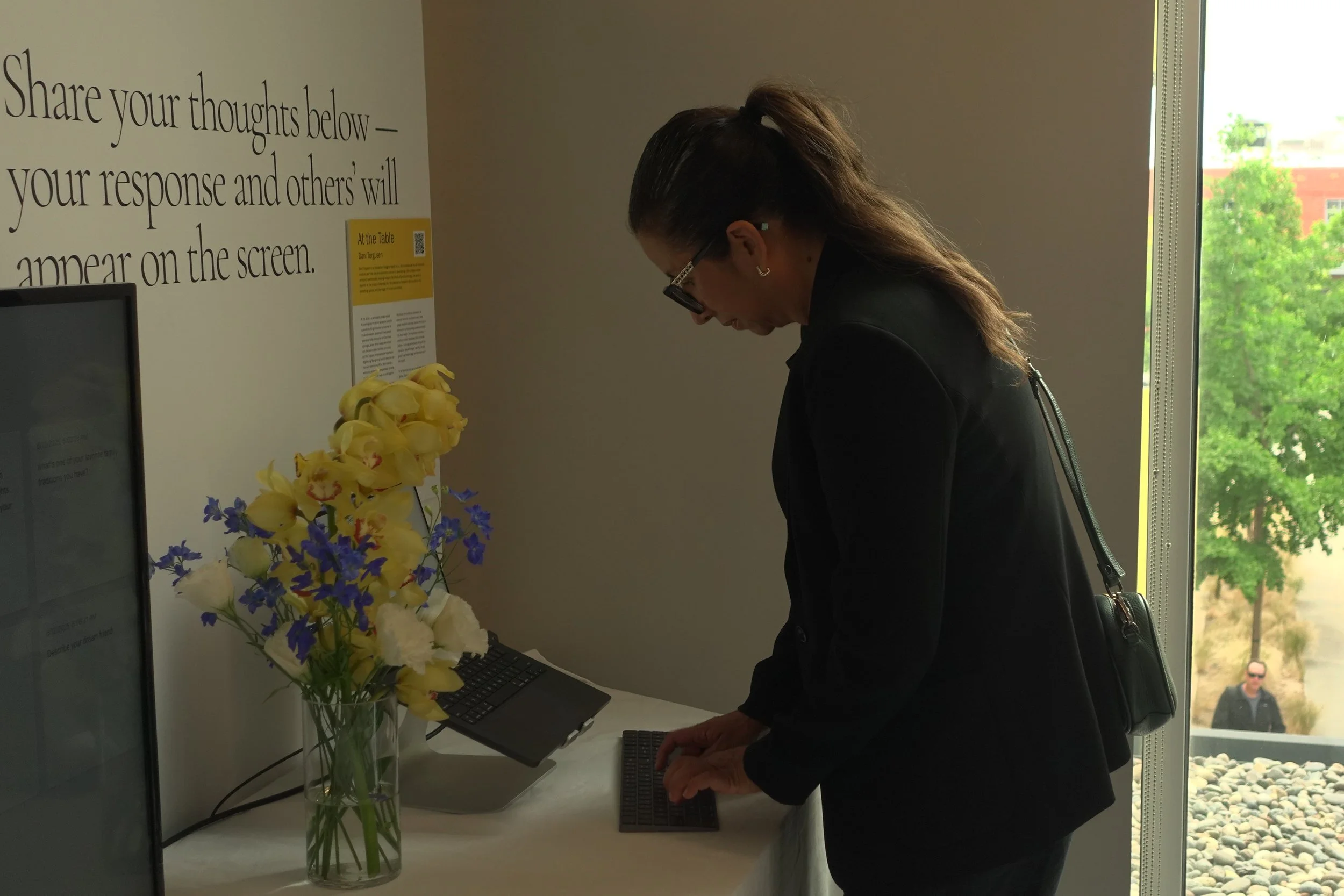 The final installation of At The Table brought together handcrafted ceramics, interactive media, and spatial storytelling to create a powerful invitation for connection. The ceramic tableware was the heart of the project—each piece embedded with a unique question that encouraged deeper conversation and reflection. The immersive tablescape featured thoughtful composition to create an atmosphere of warmth and intentionality. The installation was not only visually striking but emotionally resonant—visitors were drawn in by the beauty, and stayed for the meaning. The "Ask a Stranger" wall became a dynamic extension of the dinner table. Using an interactive interface, participants typed their answers to a curated question, which were then projected live onto a nearby screen, where they could view responses that had been collected throughout the night. Visitors lingered, talked, took photos, and—most importantly—engaged with strangers and loved ones in deeper ways. The project succeeded in transforming a physical space into a participatory, emotional experience that modeled how design can foster community through care and conversation.