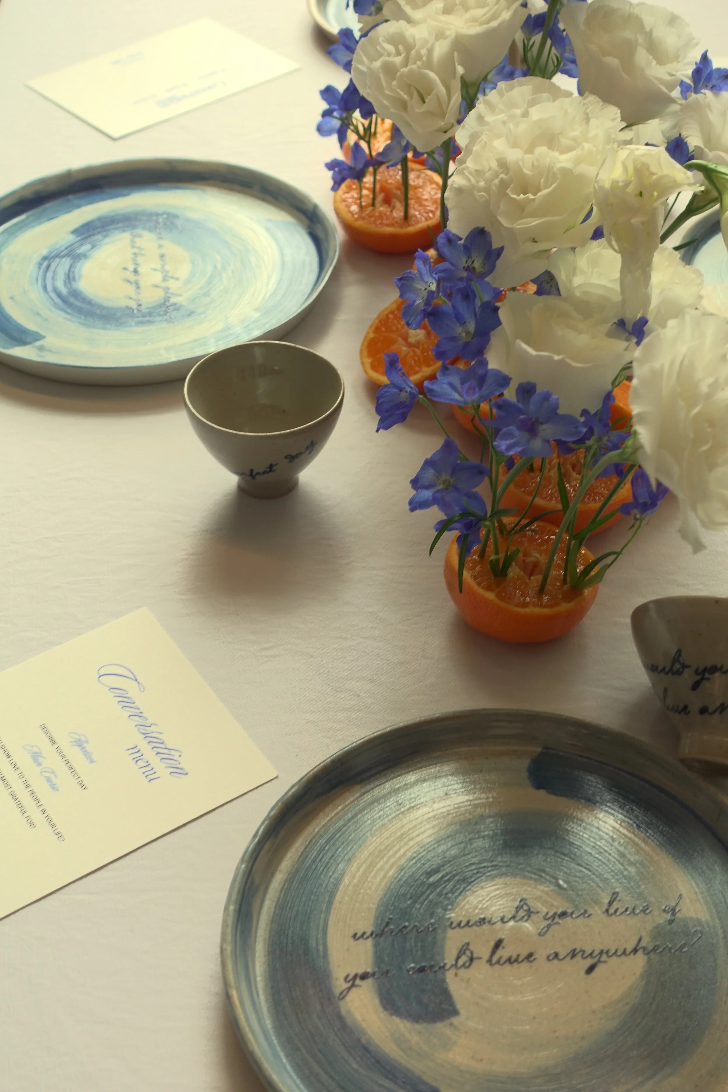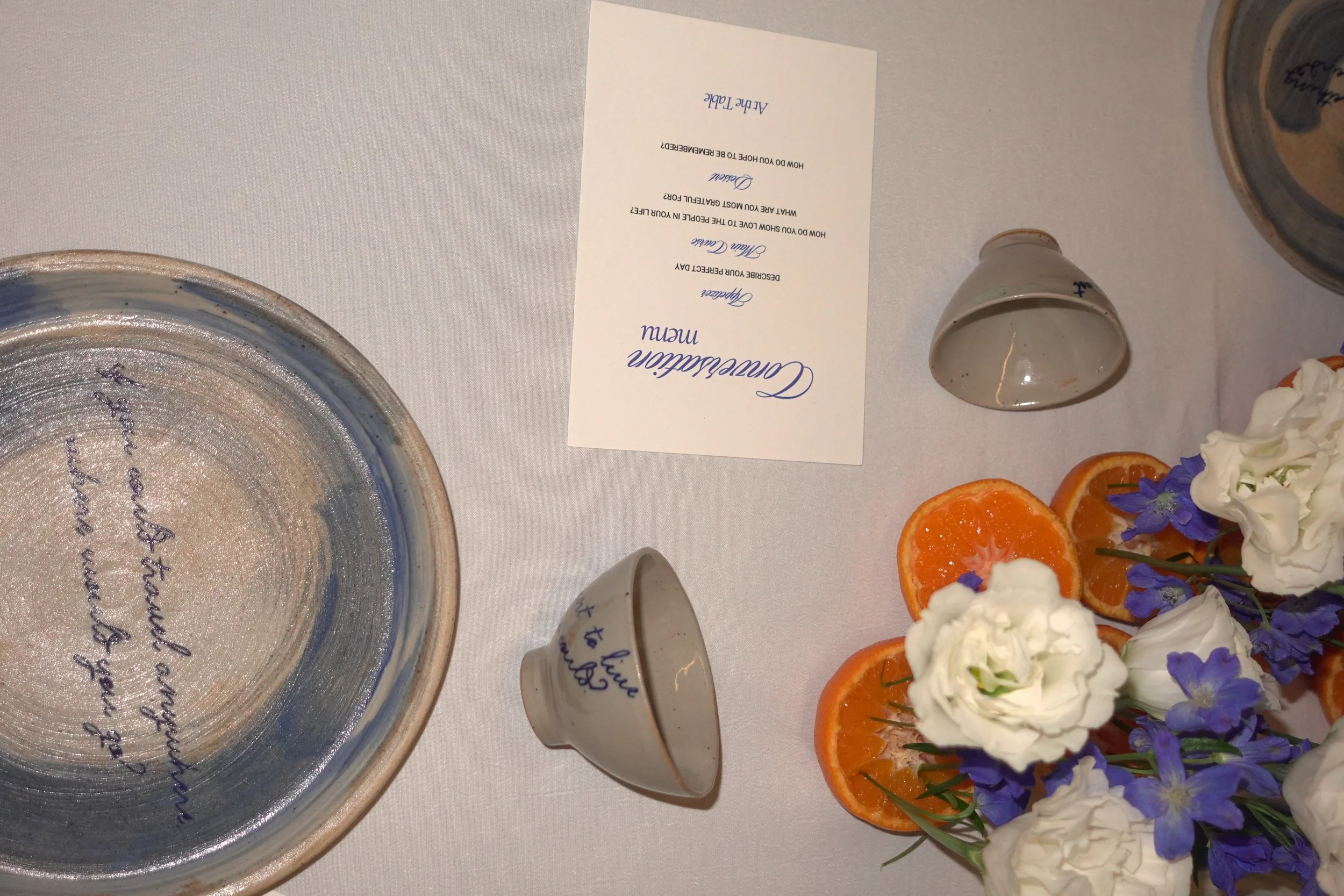 In the studio, I hand-built ceramic plates, bowls, and cups, integrating the chosen questions directly into the physical design.